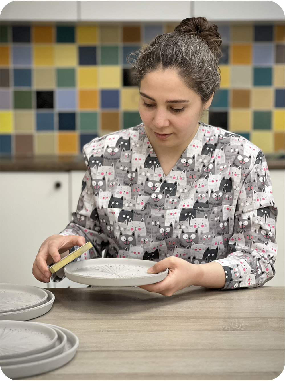 I am Elham Hosseinour Qashqaee, born in 1983 in Shiraz, Iran. I began my creative journey studying theater directing from 2004 to 2010. Since 2010, I've been working professionally in photography and videography, gaining valuable and diverse experiences that continue to shape my work today. In 2015, I got introduced to the world of pottery and ceramics through my husband's profession as the creator of Doyek Udu, a percussion instrument crafted from clay pots. Under the guidance and encouragement of my esteemed mentor, Keyvan Fehri, I ventured into crafting ceramic jewelry, starting with bracelets which later expanded to include earrings and necklaces. With further expansion, the production of ceramic dinnerware & vessels has now become the focal point of my creative colleciton.